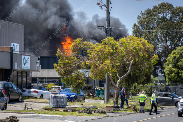 A factory fire at Kimberley Rd Dandenong South, flames and smoke from the roof.