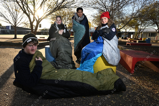 Winter Sleep-out at Emmanuel College, Point Cook. Pic of students: Sam, Maja, Matthew and Kayleigh. Photo by Damjan Janevski. 485343_03