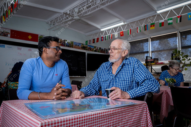 World Cafe participant Ruwan Nawaratna Hettige with volunteer Brad Harris. Picture: Ben Gross 533988_03