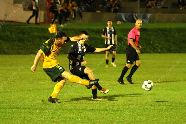 Berserker’s Damien Clinton clears the ball with Nerimbera’s Jack England applying pressure.