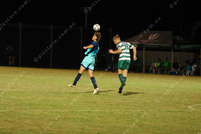 Clinton’s Lincoln McEarlin wins the header with Cooper Lems on his back.