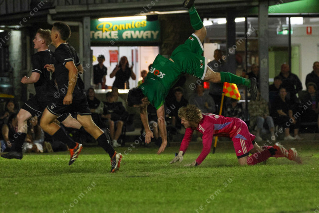 Clinton’s Ethan Munster takes a spectacular tumble over the Central keeper Michael Elsasser.