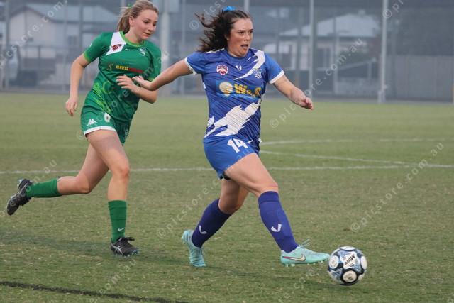 Bluebirds’ Eliza Connors takes a touch forward as Clinton’s Tiarna Warhurst trails behind.