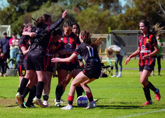 City players celebrate a goal during the 2025 FFS Senior Womens Grand Final match between Mildura City and Irymple Knights.