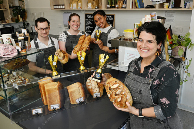 Ottimo Bakery, Sunbury took home 3 1st places at some recent baking awards. Pic of owner Bec Bremner (front) and staff (L-R): Mitch Xuereb-Graham, Louise Reid and Windjana Ambatali. (Damjan Janevski). 513230_06