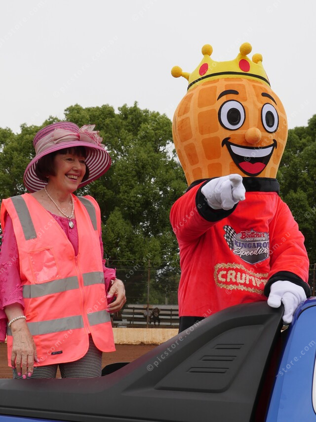 Mayor Kathy Duff with Kingaroy Speedway mascot all smiles at the Stephen Wheeler Memorial race meet. 516251_16