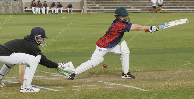Tod River Souths’ wicketkeeper Gabe Treagus is about to take the ball for a potential stumping after a big swing from Wayback batsman Adam Pollard. (Jack Davies: 536653_01)