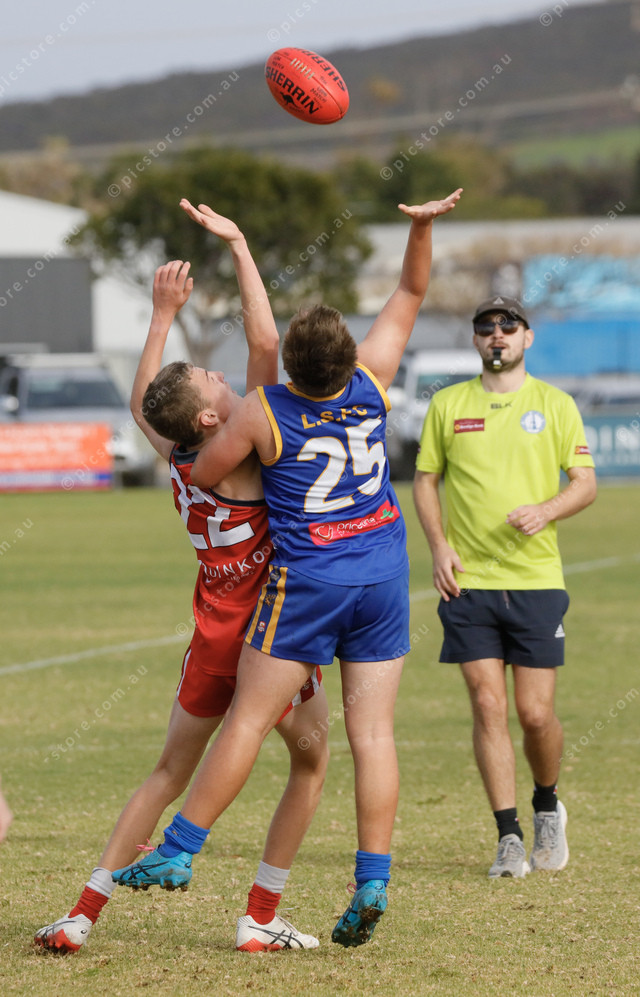 Tasman Imperial’s Archer Edmonds and Lincoln South player Raefe King contest the ruck tap. (488022_13)