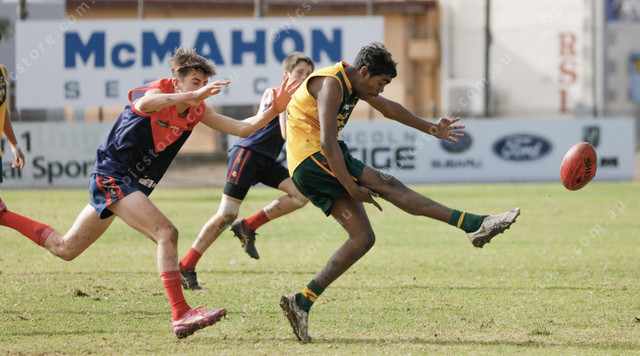 Jayce Peel gets his kick away for Mallee Park with Wayback’s Nash Christian close behind. (488022_21)
