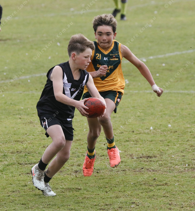 Maddern Lienert is about to kick for Marble Range as Mallee Park’s Fred Agius gives chase. (500964_03)