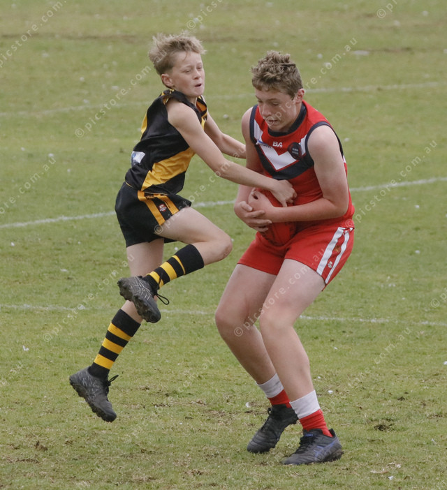 Jake Hincks marks for Tasman Imperial in a contest with Boston’s Bentley Cindric. (500964_14)