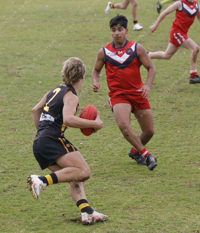 Boston player Mitchell Kotz looks to evade Tasman Imperial’s Dev Dev. (500964_17)