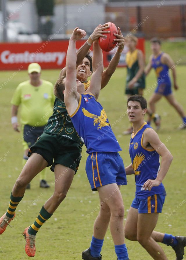Lincoln South’s Isaac Sampson marks ahead of Mallee Park player Jyezaiah Cook. (500964_22)