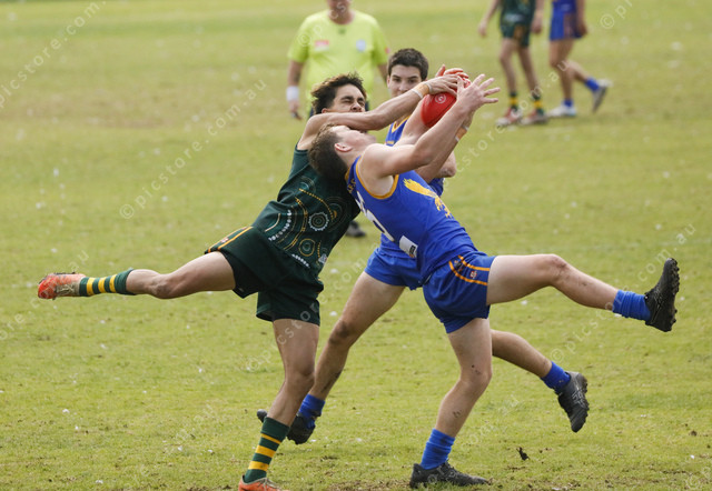 Lincoln South’s Isaac Sampson marks ahead of Mallee Park player Jyezaiah Cook. (500964_23)