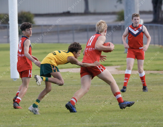 Mallee Park’s Tyrell Peel tackles Tasman Imperial’s Noah Connolly. (494724_19)