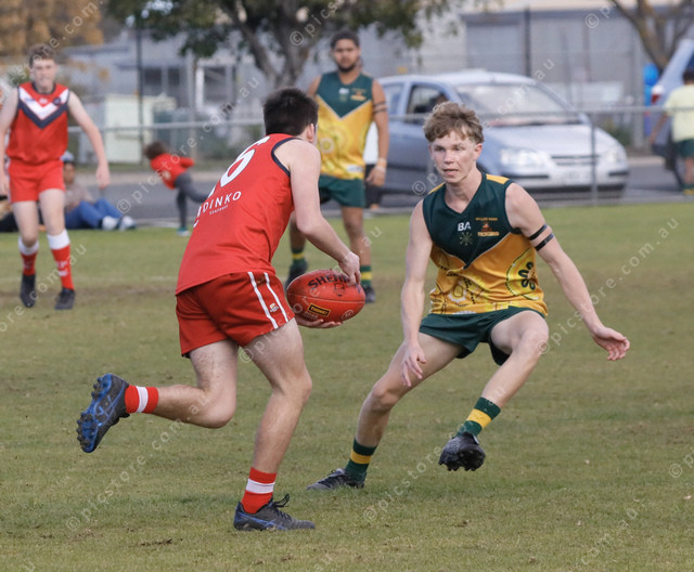 Tasman Imperial’s William Casserley is defended by Mallee Park’s Ezraeh Ligteringen. (494724_23)
