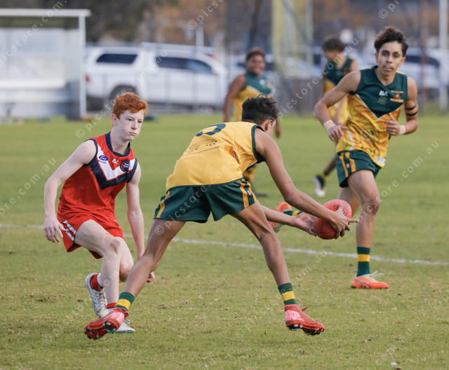 Tasman Imperial’s Logan Rawling closes in on Mallee Park player Blake Wells. (494724_24)