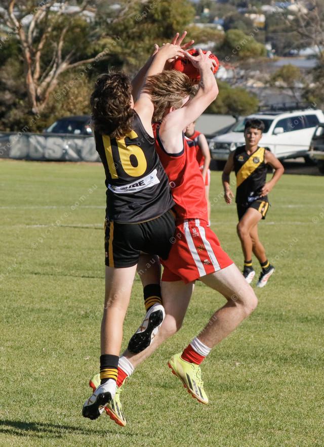 Oskar Kurovec marks for Tasman Imperial ahead of Boston’s Storm Turner. (478165_13)