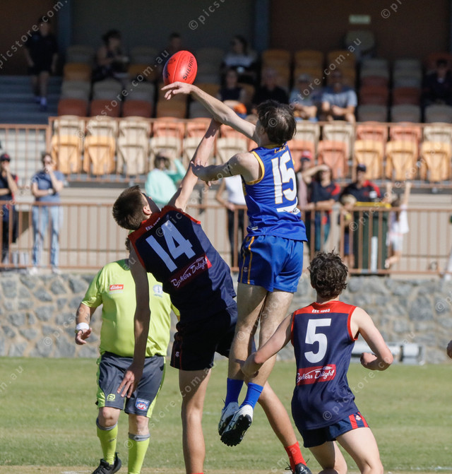 Jevyn Traeger wins the hit out for Lincoln South over Wayback’s Lucas Blight in the under 17s. (478165_17)