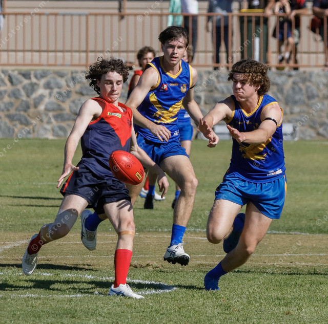 Oakley Reidy gets a clearing kick for Wayback under 17s. Lincoln South player Jack Newman attempts to smother. (478165_20)