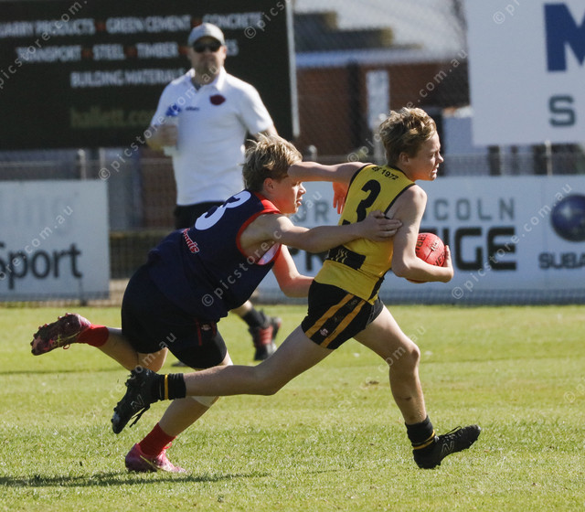 Wayback’s Koda Elefsen tackles Boston player Danciel Rocchi in the under 14 preliminary final. (504341_07)