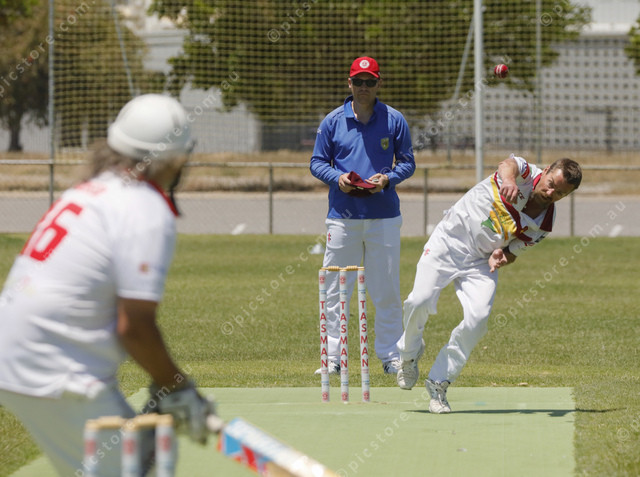 Troy Dunn bowling for Southern Eyre South to Tasman’s Jason Fauser in the B grade cricket. (525583_18)