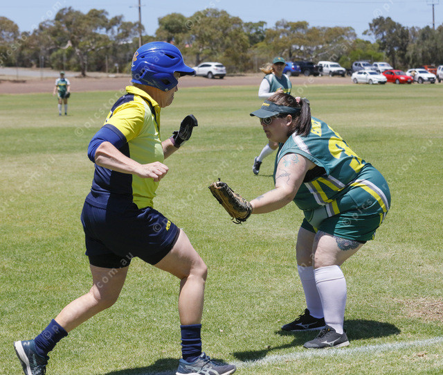 Roarunners’ Emily Pobke has the ball in her glove ready to tag Eagles’ Patrina Coombs in the B grade. (525583_23)