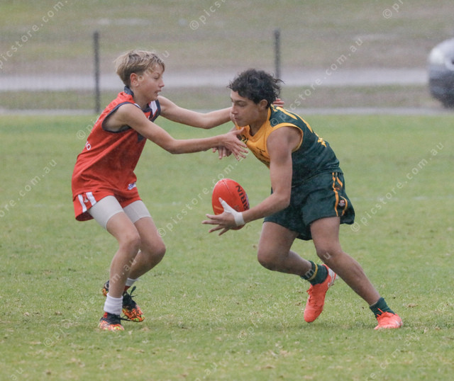 Tasman Imperial’s Makai Fauser tackles Mallee Park’s Kyson Driver-Roderick. (485300_09)