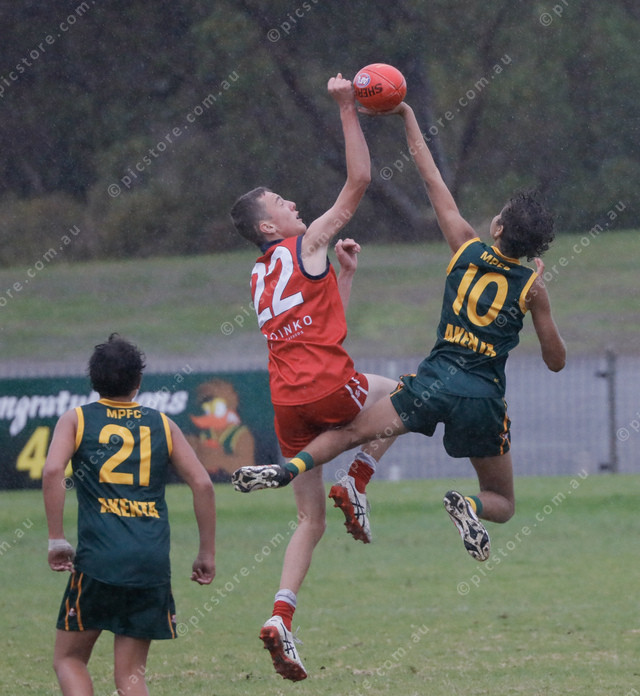 Tasman Imperial’s Archer Edmonds and Mallee Park player Lindsey McLean contest the ball. (485300_11)