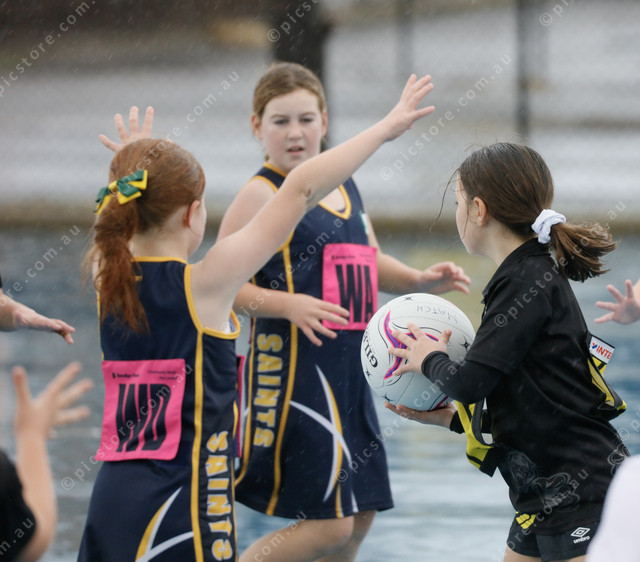 Boston under 11 netball player Amity Mantle looks to pass the ball, defended by Saints wing defence Kahla Roach and wing attack Lexi Coad. (485300_15)