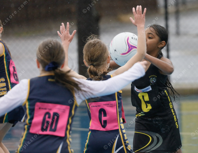 Boston centre Jada Jackamarra is defended by Saints centre Maddison Jenkins and goal defence Asha Hansen. (485300_19)