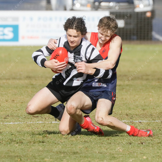 Wayback’s Jedd Bigg lays a tackle on Marble Range’s Riley Lang. (485300_22)