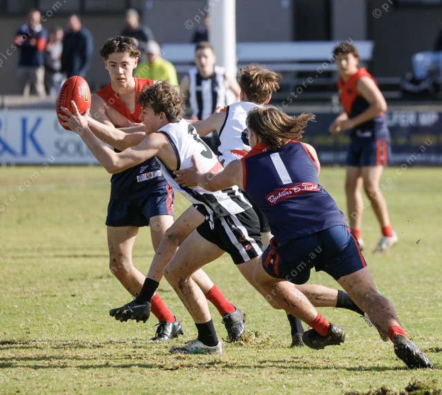 Rangers’ Arj Slater looks to burst through the tackle from Wayback’s Drew Baldwin. (485300_26)