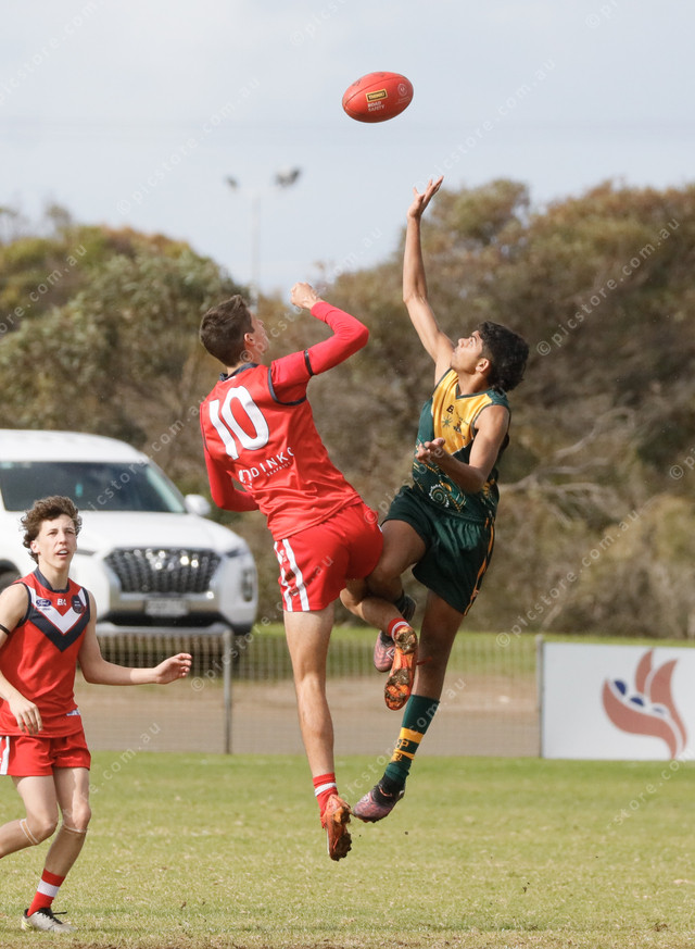 Tasman Imperial’s Sam Lydeamore and Mallee Park’s Terence Betts contest the ruck tap. (485300_33)