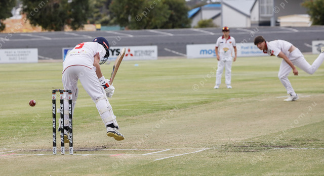 Southern Eyre South’s Bryce Markey bowls a delivery to Tasman’s Jai Semmler. (460709_14)