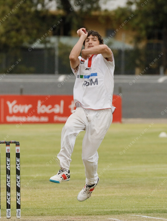 Bodhi Fauser steams in to bowl for Tasman in the A grade. (460709_32)