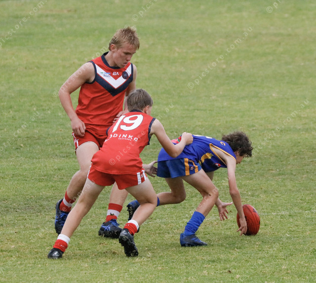 Eli Chambers gets the ground ball for Lincoln South as Tasman Imperial’s Cooper Boyce tackles and Noah Connolly watches on in the under 14 game. (479821_07)