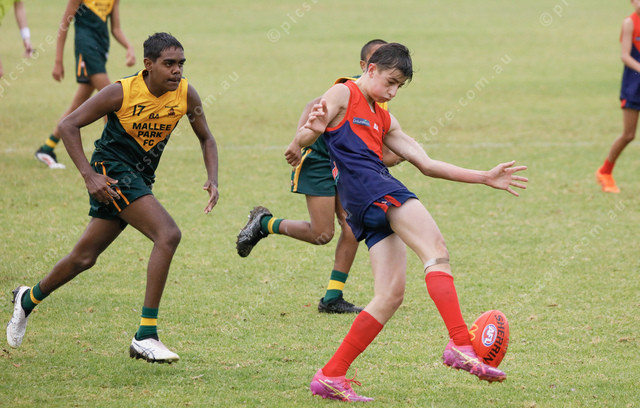 Nash Christian gets his kick away for Wayback as Mallee Park’s Jayce Peel gives chase. (479821_13)