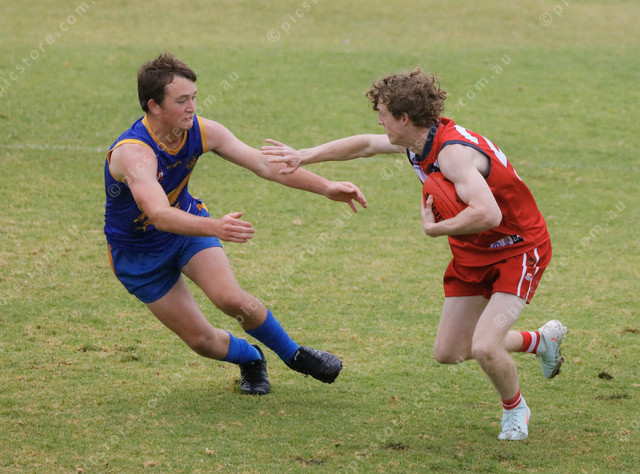 Tasman Imperial’s Ashton Batterbury is about to attempt to fend off Lincoln South’s Isaac Sampson in the under 17s. (479821_15)