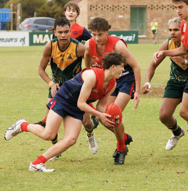 Tyler Davidson picks up the ball in traffic for Wayback in the under 17s. (479821_21)