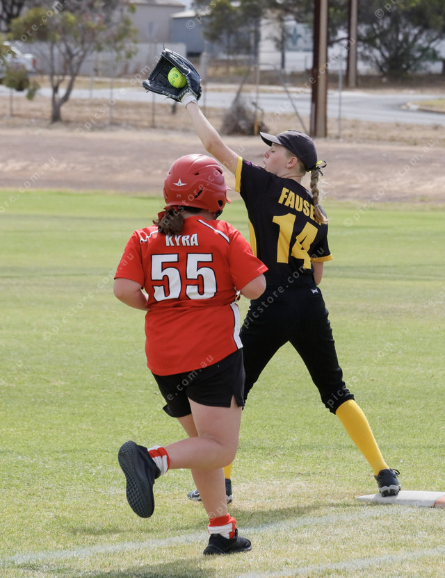 Kimberlee Fauser catches the ball at first base before Squaws’ Kyra Sweeney could reach the base. (462155_18)