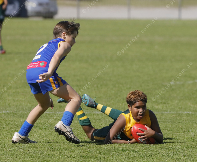 Javieah Jackamarra holds onto the ball for Mallee Park as Lincoln South’s Esix Curtis closes in. (499174_18)