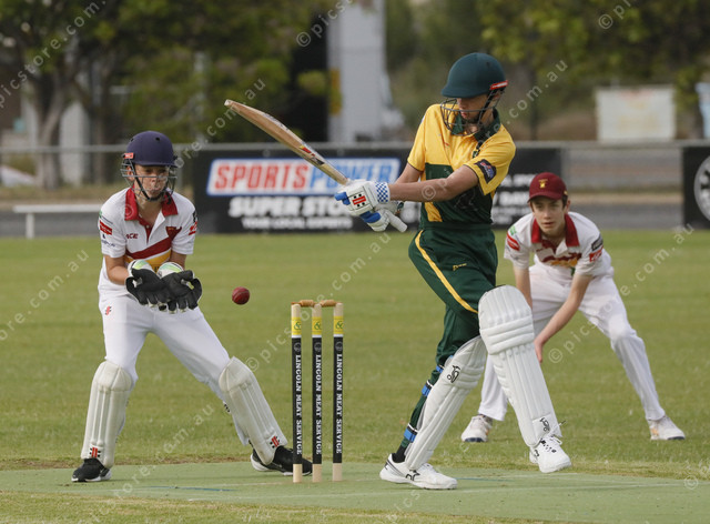 Lachlan Woodward batting for Charlton in the senior colts. Southern Eyre South wicketkeeper Jordy Parker is about to glove the ball. Jarrah Barr watches on from first slip. (513896_06)