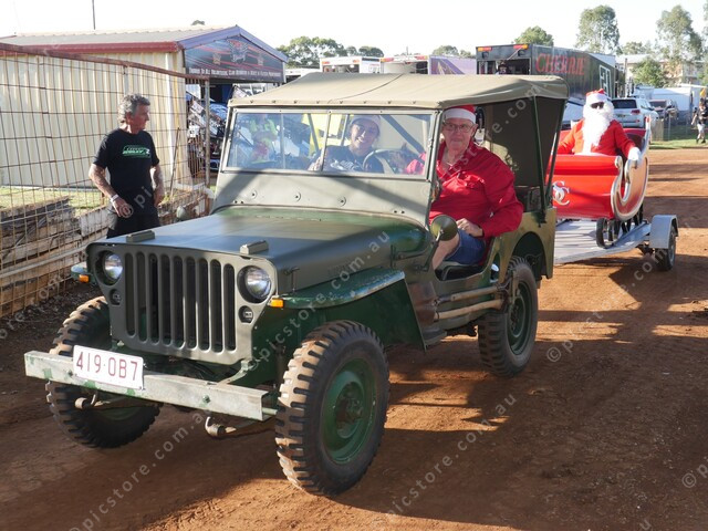 Santa arriving on his sleigh which is being pulled by an army jeep. 526803_14