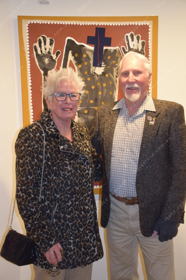 Jacqui Large and Les Fletcher were among the many locals who turned out to support the latest exhibition by Chris Worfold, featuring bold lines, layered meaning and vibrant energy.