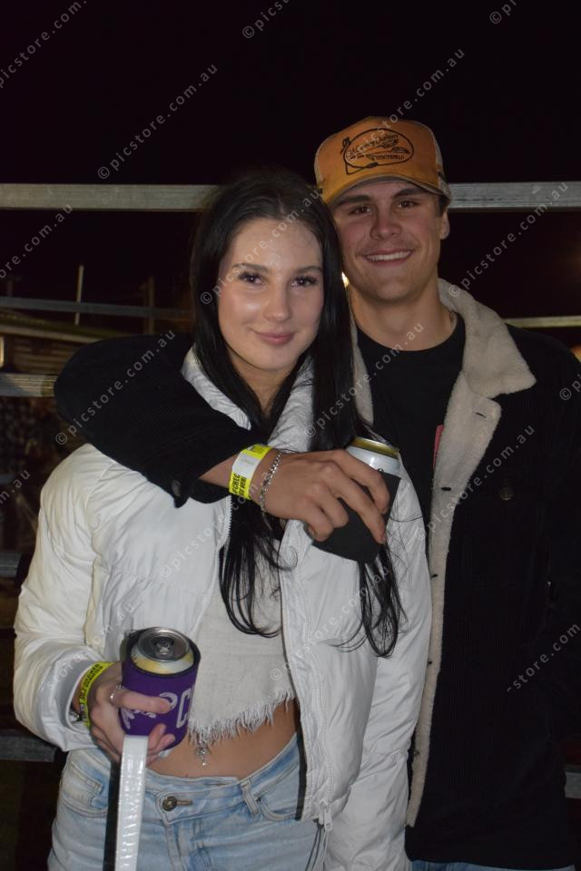 Claire Danzey and Charlie Wooler kept warm with good company and great rodeo action on a brisk Stanthorpe night. (Samantha Wantling: 482165)