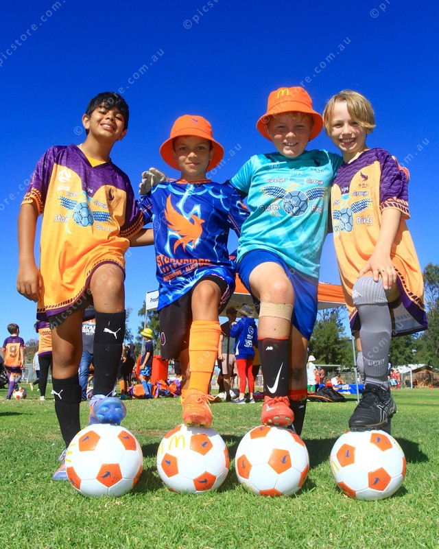 READY: Stormbirds players Ryan Batra, Jack McBryde, Bernie Barwick and Ted Dohler get ready to kick off with their new soccerballs(PIC: PHIL WILLIAMS 477904_06)
