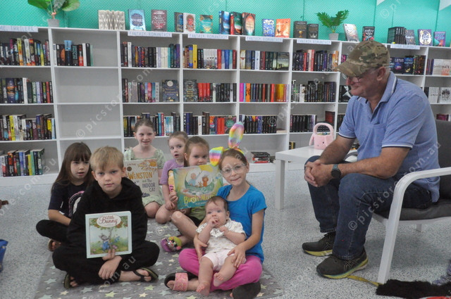 Cassandra, Toby, Addison, Emilly, Maddison, Bianka and baby Romilly enjoyed storytime at Books ‘N’ Pieces with storyteller Kevin Hall. 471158_04