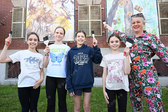 Local Hobsons Bay school art club students are having their work displayed at the Substation. Pic of Grace, Eliza, Sadie and Olive with art facilitator Georgia Ensor. (Damjan Janevski). 515737_02