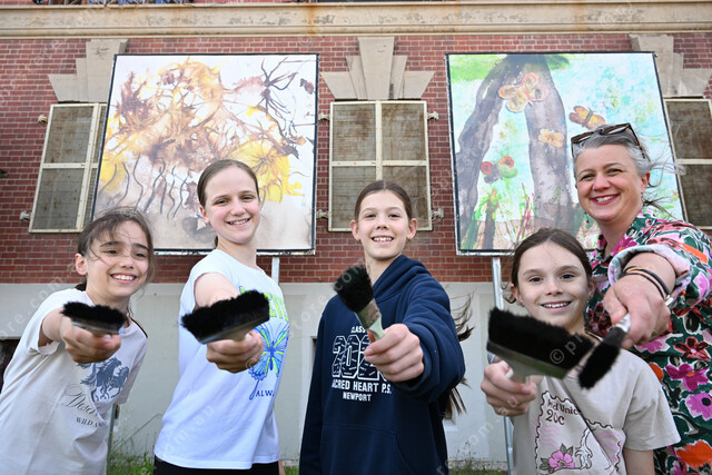 Local Hobsons Bay school art club students are having their work displayed at the Substation. Pic of Grace, Eliza, Sadie and Olive with art facilitator Georgia Ensor. (Damjan Janevski). 515737_04